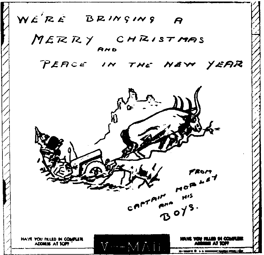 "The fellows had gone to a lot of trouble to fix the place up as Christmasy as possible. There were little Christmas trees scattered about the house with home-made decorations: colored paper, streamers, designs cut from tin cans, etc. (Another interruption---afternoon tea.) A great long table had been set in a narrow hallway. On the table were oranges, nuts candy, and a bottle of beer at every place, also cans of cigarettes. We first went into the office and sat around a fire where we gradually met the various fellows attached to the MAC---all English. The Lieutenant in command wandered in to meet us---and here I discovered another tradition in the British Army. The Lt., a slim, pleasant young chap, had on over his uniform an apron. It was explained to us ignorant Yanks that on Christmas day the officers wait on the men. John told me that in the morning the officers had come around to the billets with steaming pots of tea and had served them their breakfast in bed! For those that wanted it they had bottles of whisky and poured a lot in the morning tea---a pick-me-up! The Lt. couldn't stay long because he had his work to do and with a mock courtesy in his bedraggled apron he swallowed a bit of cognac and was off."