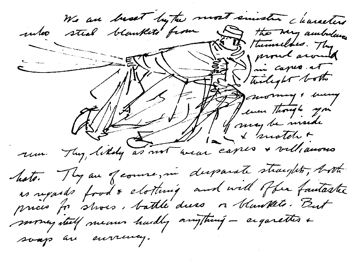 "There are a few other little items of local color that might interest you---things I learned from British drivers who have been here since the town fell. The road thru town has been given the name 'Panic Drive'. The reason is that when the Jeeps hit the edge of town they put her into low gear and 4-wheel drive and open the throttle wide, roaring thru town at about 50 to get up momentum to carry them in a hurry up the road out of town, which is under complete and direct observation. This is the road that only Jeeps and mules can travel on. It is pitted with bomb craters and mud holes, is narrow and steep and winding, and has been given a name-'The Mad Mile'. I walked a little distance up the Mad Mile until discretion got the better of foolishness, and it was quite a road. I can well imagine a tiny jeep zooming along like a bat out of Hell, hitting only the tops of the ruts. In fact they have a sign up along the road reading: 'Beware of Low Flying Jeeps!'"