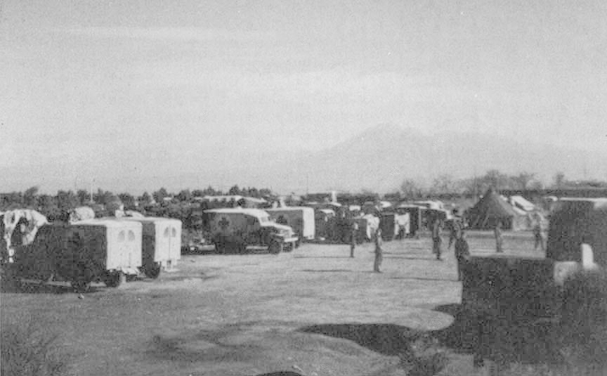 Some of 485 Coy's ambulances parked in camp near Monte Cassino. |