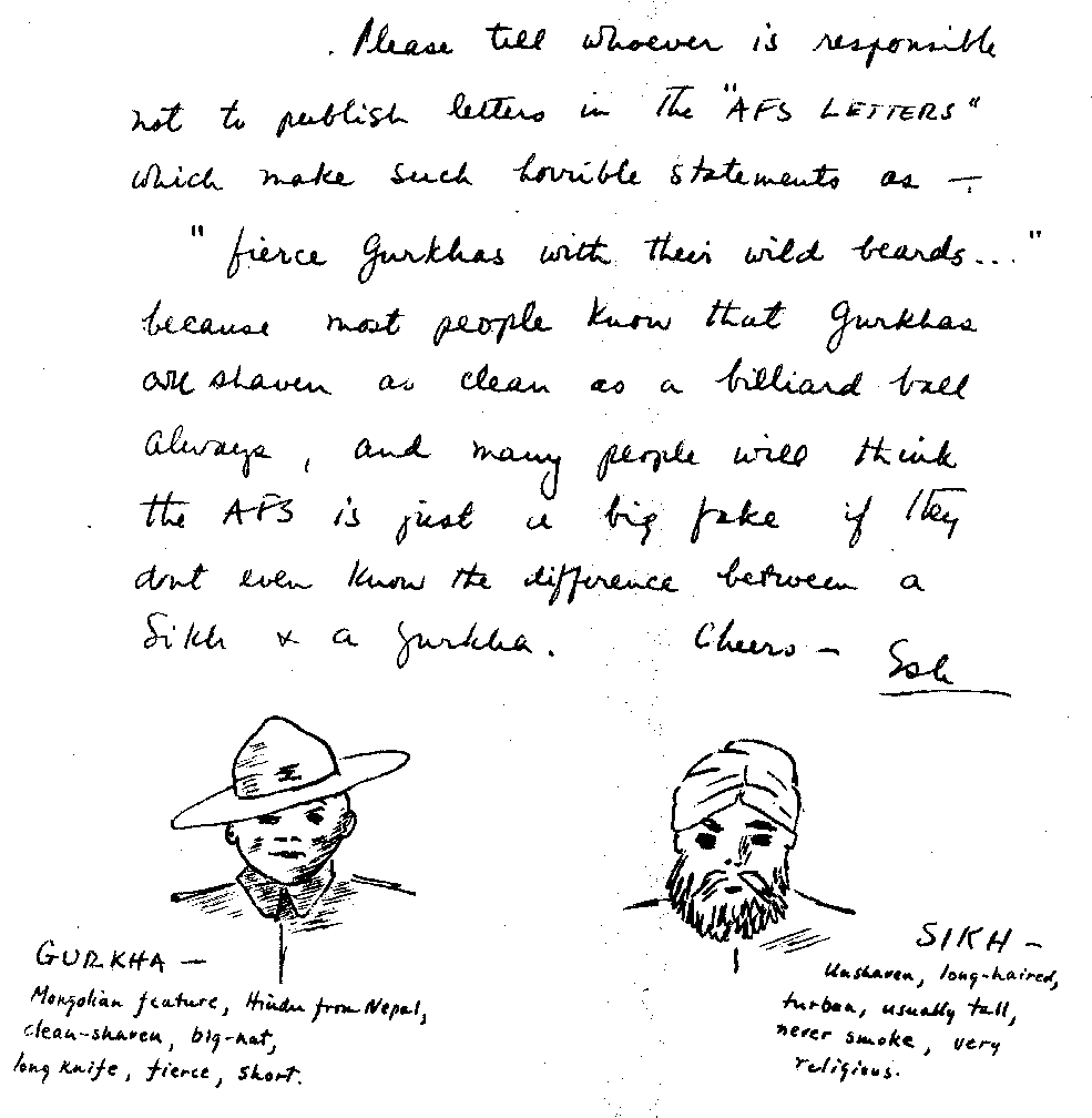 "All during the day the Gurkha troops stop in to see me. They are wonderful little follows, always smiling and never forgetting their place. Being mercenary troops and coming from the free state of Nepal, they are the best jungle fighters in the world. These mongolian featured boys are short, stocky and strong as an ox and nothing is too much for them. I saw one of them get seriously wounded by a hand grenade in combat and all the others who were around stopped what they were doing, ran over to where the fella was hurt and then literally rolled over laughing. They are always that way --- getting a big kick out of it when one of their lot is wounded. They laugh and carry on in such cases as much as to say 'Why, the damn fool got in the way, Ha, Ha! ' Eventually they noticed me and said 'Thik Hai, Sahib'. Then some more ha-has. But regardless of their sense of humor they would never let the bara white sahib down, and there isn't a man in the British army who'll not give them the highest praise.