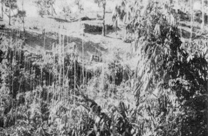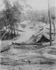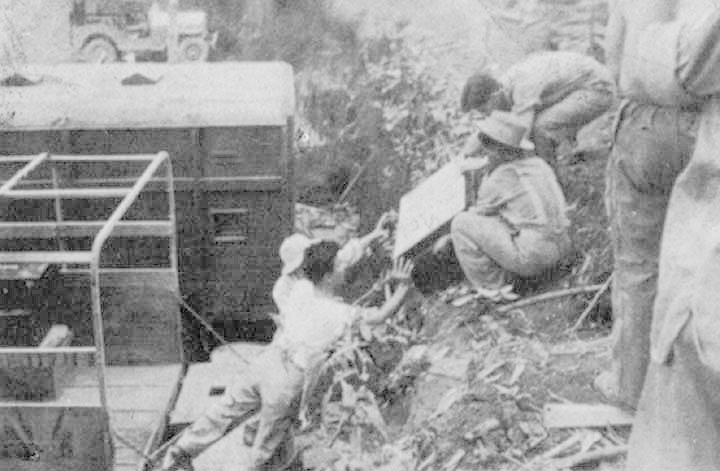 "Our breakdown was caused by blowing out the gasket in the cylinder head and was repaired in a couple of hours the next morning so we continued on. The next day part of the road reminded me of the farmer seeing an elephant for the first time. 'There ain't no such animal'. It was a new track, in fact they were still building it and using elephants for the job. We didn't see any, but we saw what they left behind. It was just wide enough for a jeep and the grades, curves, density of the jungle topped anything I had seen before, also many more birds and monkeys. We almost ran down one family of the latter, which crossed the track and scrambled up a bank which was too much for the youngest member to negotiate. Such a chattering and scolding as the others left him behind. Late that afternoon we crossed the same river at another point. They were using captured Jap barges and were too busy to take our jeep so we borrowed one on the other side and continued for an hour by the eerie light of a full moon over a track that would be wonderful to scare little children. It was Saturday night when I got back to headquarters and on Sunday night we had a New Year's Eve party.