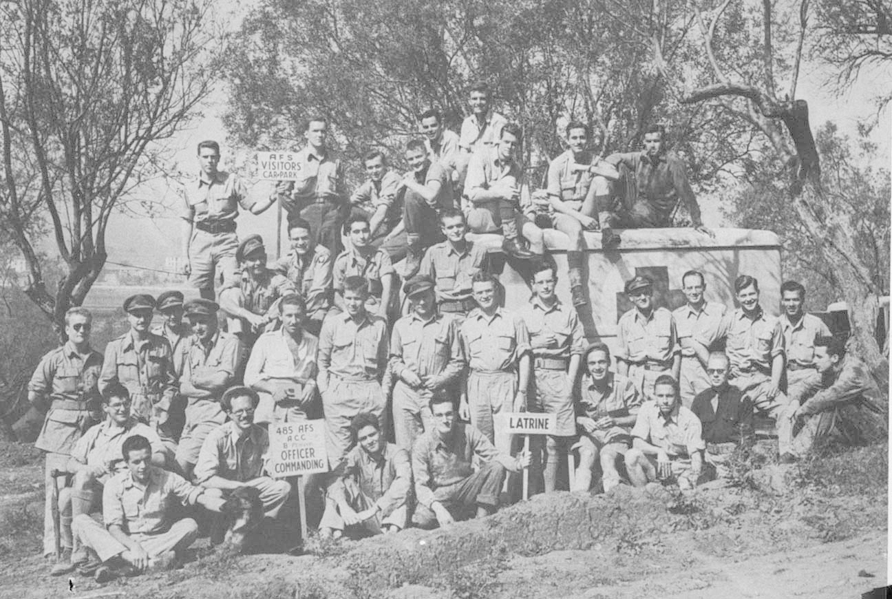 485 Company, or Coy, as it is designated in British abbreviated form, was born in Syria in the spring of 1943. AFS in the Middle East was divided into two Ambulance Car Companies which were given (apparently at random) the numbers 11 and 15. Then, for reasons of their own, the British commanders decided to re-arrange the AFS numbers in North Africa. AFS drew the numbers 567 (the Chicken Brigade) and 485. Men and cars from both 12. and 15 went into 485 in its babyhood. The first thing the new company did as a unit was to trek across the top of the African continent, on what was then the longest convoy trip to be undertaken by any part of the British Middle East Forces, driving from Baalbek, Syria, to Tripoli. In all there were 98 vehicles and they made the trip without a single mishap or road accident.