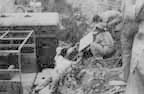 "Headline for today --- 'Tragedy Strikes AFS'. 'Mysterious Blaze Sweeps Through Volunteer Ambulance Drivers' Headquarters'. Yes, that is right. Our HQ burned down two days ago. The cause of the blaze is still a mystery but I'm sure ------has a mighty guilty conscience. In the end only two bashas were destroyed, the mess hail and the one in which I was slumbering in sweet repose. At about five in the morning one of the fellas started yelling 'fire' , but we all told him to go back to sleep as he was merely having a nightmare, but then we smelled it. Sure enough, it wasn't a nightmare. As fate would have it, the first bucket of water to be thrown on the fire was the one in which I had left all the pictures I'd printed the night before. All the pictures were destroyed. As a matter of fact that was the only loss of personal property. We tried our hardest to limit the fire to one basha, but our efforts were futile, so we quickly retreated and set up new and stronger defences on the third. Bashas being made of straw burn like celluloid and what's more, the roofs are only a foot apart. Well, our third line of defense was strong and consisted of a bucket brigade to the roof on which I perched as a wet blanket beater, a wall pusher-in group whose job it was to see that all falling timbers fell in the opposite direction from still whole bashas and a water supply-in-hand group who put out what timbers the pusher-in group failed to push. After about three hours the fire was checked and for all weary firemen, breakfast was served on the terrace (the mess hall was no longer). The party broke up at 10:00 a.m. and a good time was had by all."