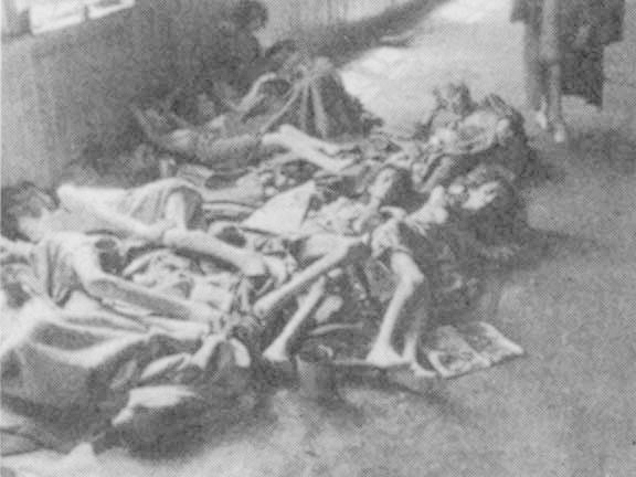 "As we drove into a block our first day, we had to drive carefully to avoid running over bodies of persons who had died as they ran out to beg for help, or where they were thrown by their cellmates. In the blockhouses some of the women actually used dead bedmates as pillows ---the only pillow they had had in years.