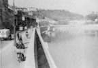 "From Bishwiller, about 15 miles east of Haguenau and the jumping off point of the French drive north into Germany west of the Rhine, we worked just about steadily until a few weeks ago. After a string of towns in the Palatinate, we crossed with the French in their bridgehead at Speyer. It was quite thrill, because it wasn't until then that we really considered ourselves in Germany. We evacuated back across the Rhine for a while at a place where there wasn't a bridge. They tied a couple of pontoons together and put some planking across it and you had a sort of ferry, which you drove onto over two wooden timbers---not without uneasiness, I can tell you. We headed toward Stuttgart for a while, then changed our direction and headed due south as far south as Freudenstadt. Then we headed southeast until we got almost to Austria and there wasn't much point in moving farther. Until very near the end most of the night work had to be in absolute blackout because there still were a few stray Jerries in the air who would shoot up the roads if they could. The main problem of a rapid advance like that was the pockets of Germans behind the non- existent front. It's now pretty safe to drive through the forests at night, but it wasn't until fairly recently. So far there's been little or no trouble from the 'Werewolves, as the Germans wistfully call their mythical resistance movement."