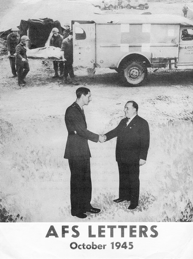 | Our cover this month is symbolic of the close cooperation between Col. R.A.F.. "Williams, Assistant Military Attache of the British Embassy in Washington, and Mr. Stephen Galatti, Director General of the American Field Service. Their most cordial relations were largely responsible for the effective work done by the AFS throughout the war. |