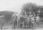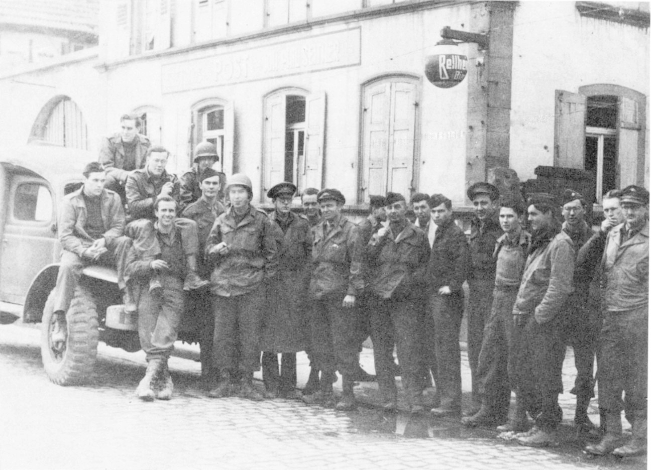 AFS ambulanciers of the 2nd Section, with the French 1st Army were the first volunteers to enter Germany, March 24, 1945. Gathered outside the town restaurant which they used as a mess in Herxheim, Germany, they are: left to right (seated) Brinton Young, William Wallace, Richard Norton, Donald Gulls. (standing) James Salinas, Robert Moore, Carl Harris, Joseph Lippincott, Robert Fenwick, CHARLES ALEXANDER (later killed) Gayle Smith, Frederick Blow, Wright Nodine, Melvin Braunstein, Eli Rock, Mark Ethridge, Donald Elberfeld, JACK DOUIHITT (later killed), Peter Warren and Edwin Davis. Photo by Cuddy |