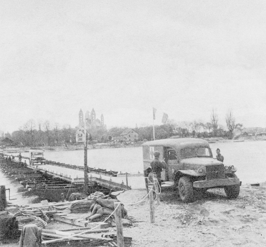 This will be my last chance to write for many a day so I will rush this off. Three days ago the British Medical Colonel in charge of the advance dressing station unexpectedly had a spare jeep ambulance and thru great luck I got an assignment. I wish you could see it, a regular jeep but all covered over with an awning and Red Cross in red and white painted in front and both sides. Inside, two stretchers and one extra seat behind me facing stretcher for sitting up case. So I carry three patients from the front (Advance Dressing Station) to the back line dressing station, called the M. D. S. sometimes 10 miles back---sometimes 40. We live in our ambulance at the A.D.S. to pick up wounded as they come in,