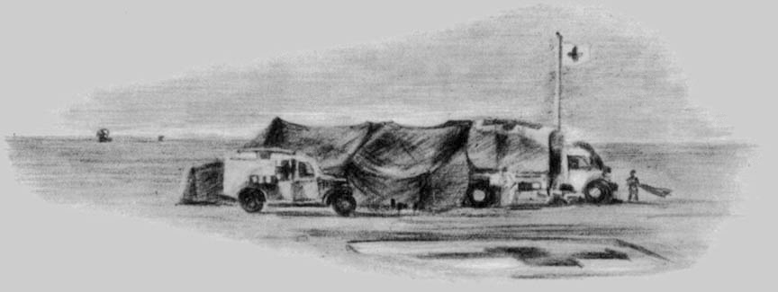 After a few days of this, we were ordered some miles forward to an ADS. There still wasn't much in. the way of warlike things on the trip West: all we saw were vehicles parked here and there on the desert, and streams of military vehicles on the track. But, as we approached the lines, we came to minefields and to guns and to lorries and men dug into sheltered positions. A Red Cross flag waving atop a large tent showed us the location of the ADS. All around, gun batteries were in evidence, and their noise shook the ground. War came closer in the air, too. We saw many a dog fight and bombing raid while stationed here. We were here four days, evacuating patients back to the MDS. Then came news that we were to go to the RAPs.