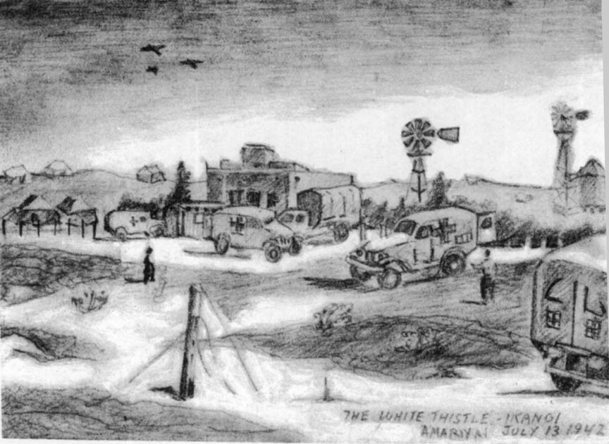 We were like phantoms driving into the early morning mist. By nine o'clock we were 5 miles SE from Bir Hacheim. Then we were told that Hacheim had been evacuated and that we must be prepared to help the wounded and others who had managed to get out. It wasn't long before we saw the wide formation of trucks, Bren gun carriers, gun pullers, and every type of vehicle coming across the desert. For hours after that we were busy unloading wounded from trucks, loading them into our ambulances, feeding them, bandaging them, listening to their tales of the horror of the evacuation.