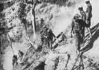 MEN OF 123 BRIGADE CLAMBER UP A JUNGLE PATH |