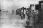 We stood rimming the edges of our hurrying trucks. Our eyes were being opened and filled with the new wonders of this strange land into which we had been dropped. On our right was the Suez Canal. In the distance to our left rose a rugged, barren escarpment. The white-washed sand and a few oases of fig palms in a continual panorama unrolled before us and then faded into the distance behind. We passed Arabs walking along the road, a new people to us, and their sandalled or bare feet, their long flowing robes, their turbaned heads denoted a new way of life which we were to see and know for so long. An almost unbreathabiy hot wind seared our faces.