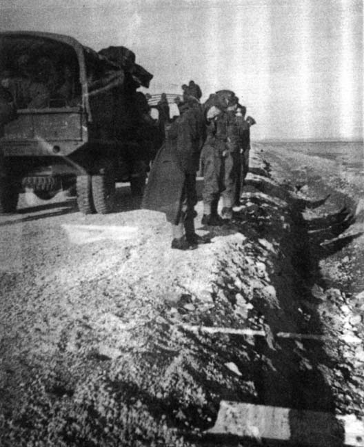 In February and March there would be chill days and nights on the Western Desert. Wearing our winter-issue "battledress," each of us with blanket-roll and kit, we were bundled onto the rock hard beds of the three-ton army lorries that carried us 1,200 miles in long single file to our destination "somewhere" east of Tripoli, Libya. Canvas covers were stretched on frames over our heads like Conestoga wagons.