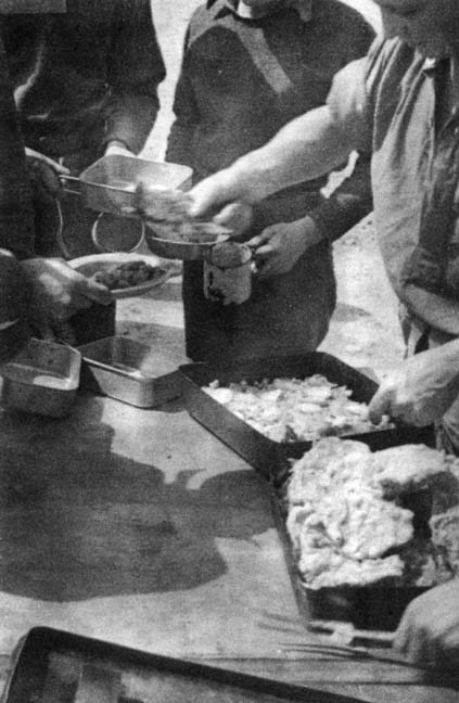 There was mush and fried bread for breakfast, cheese snacks at lunch, always plenty of tea --- and flies. When at HQ or in convoy, we formed queues in orderly British fashion, as our faithful cooks --- often a "Curly" or a "Lofty" --- dished out their offerings.