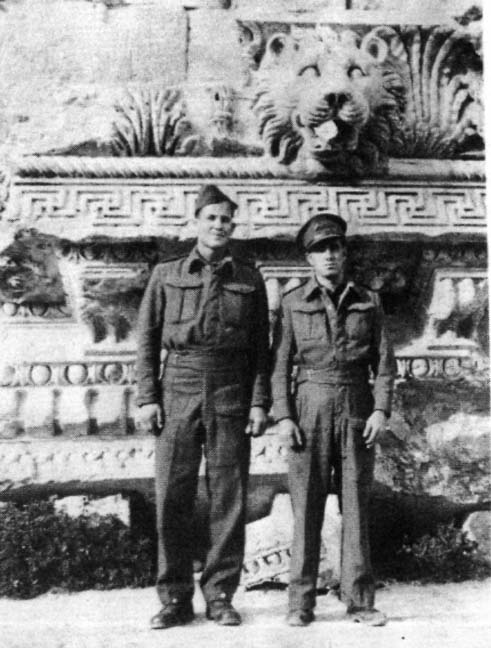 There were plenty of buttons on our British battledress, standard Army winter wear. Chan Keller and I sported our brand issue in the photo below taken under a stone lion at the Baalbeck ruins, as I wrote (December 15, 1942):