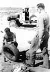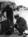 When an evacuation was completed, we could pull off into the desert and "brew up" using rations on board. Although the mine fields had been cleared in the rear areas, we were cautious and kept sand bags on the floor boards. In the photograph below, note the British Army winter-issue battledress.