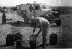 For a "brew-up" we made a fire of sand soaked in petrol taken from one of the jerry-cans slung in our side-racks. Using rationed water (we had two quarts per day) we brewed tea leaves in a battered can which we kept slung under the ambulance when not in use. Sugar made it palatable. Our insides must have resembled the blackened insides of our mugs as a result.