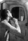 British Army regulations discouraged facial hair, with the exception of the famed "handlebar" moustache. Jock Cobb's ever present camera captured me in the act of shaving, for which he wrote the following caption: