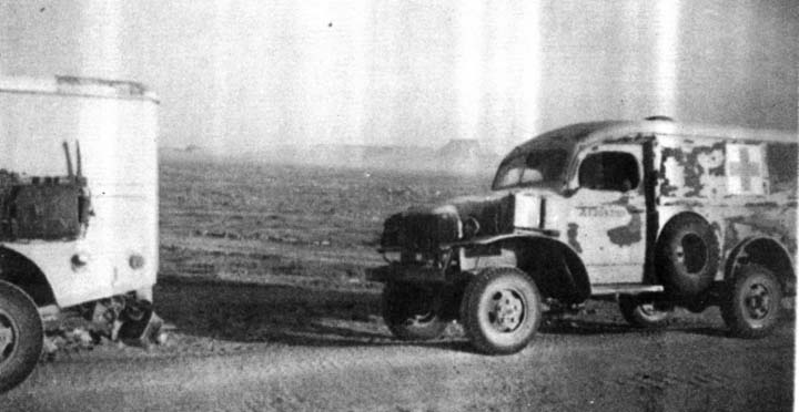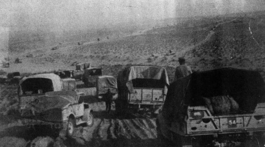 The seeming "madding throng" of our mobile Corps spewed up clouds of fine white sand which coated inside and outside, and often obscured every other vehicle from sight. At times we were uncomfortably bumper-to-bumper when forced to pass through a defile caused by mine fields; at times we were in a mad race to keep in touch with our convoy; and then we were sailing through a dim white mist of sand and exhaust smoke. In these days and nights of hectic driving we had covered about fifty miles, indicative of the congestion and the terrain. At times, the tracks were well-nigh impassable, and we depended upon our own four-wheel drive while other vehicles were being stuck.