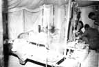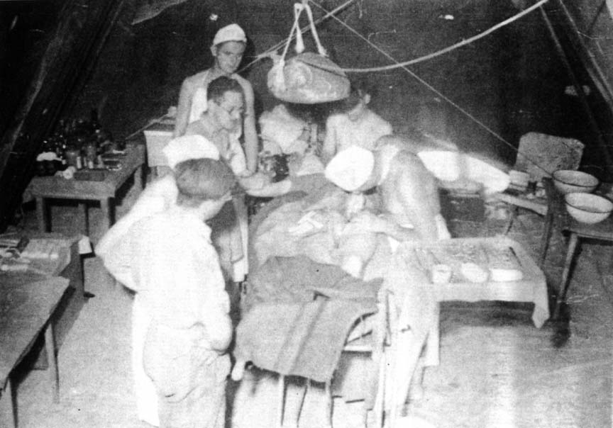 All that night the generator supplying the operating theater kept a constant guttural hum. There were men badly burned, men with bones broken, men with shrapnel and bullet wounds, men with limbs to be amputated. One man, with nose and lips burned away, was a swath of bandages. He was more ghost than man. The MO's (medical officers) after weeks of enforced idleness were suddenly rushed beyond belief and worked in shirt-sleeves through the night. They did a good job.