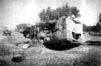 I could stand chest-high in the trench, and thus look out across from behind the bale of straw propped up at the entrance. Behind me was the shed where the farm tools had been kept. The roof was caved in and the thresher-blades of a ruined harvester jutted out beyond the roof. All about was broken glass and bits of ruined machinery rusted and mixed with straw. The pile of straw-bales, once set in a neat fashion by the farmer, was scattered about, and many of the bales had been used to frame the adjacent slit-trenches dug in the farm yard.