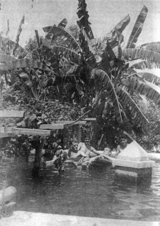 The most successful way thus far discovered has been a daily visit to Ignazio's near-by irrigation pool. The water is pumped up from a deep well, and feels ice-cold after the heat of the sun. The pool is of cement about 50 feet long and chest-high. It is covered with a grape arbor supplying shade and grapes. One swims or floats about on Jock Cobb's rubber mattress, reading, soaking in the deliciously cool water, and all about is the forest of the tops of the fruit trees, and birds singing, and the wind slapping the big slattern leaves of the banana tree which leans over the pool. Young Jeno, and Pepino, are quite playful, and so there are merry tussles in the water. It's more refreshing than the beach during such heat, in spite of the assortment of cool drinks and even ice-cream you get there.