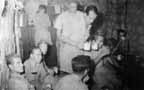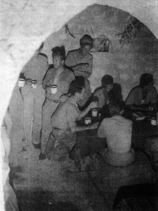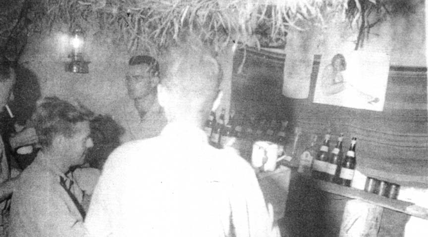 There was no limit to efforts to "beat the heat." Beyond the farms off the Castel Benito road, the Italians had built a solid, cool underground stone bunker. Ken Proctor (ME Unit 30) and Charlie Stewart (ME Unit 32), took the initiative to clear out the debris and clean it, and started the famous "Belhartzia Club" named for one of the lethal parasites that lurked in African rivers. With Ken as manager they installed simple furnishings and a well-stocked bar featuring a scantily clad long-legged Vargas pin-up girl. There were various iced drinks; fellows brought their own bottles. Popular snacks served were the "humpburgers" from camel meat of the local markets. Here we AFS "Yanks" and "Brits" and our guests escaped the heat in fellowship.