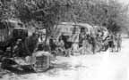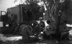 All of us by now were skilled in the 31 point maintenance check-list we had learned in training, but such thorough maintenance had not been possible during the advance to Tunis. At Tripoli, we went to work with a will to complete and continue these maintenance requirements; also to assist our fitters (mechanics) as repairs and refitting were scheduled. As always, our British workshops, then under command of Captain Webb, performed miracles. At any given time, a Section could be seen lined up under the shelter of the trees, with our fitters at work, some of us on hand, and pieces of our cars spread out on the ground. Jock Cobb's camera told the story: