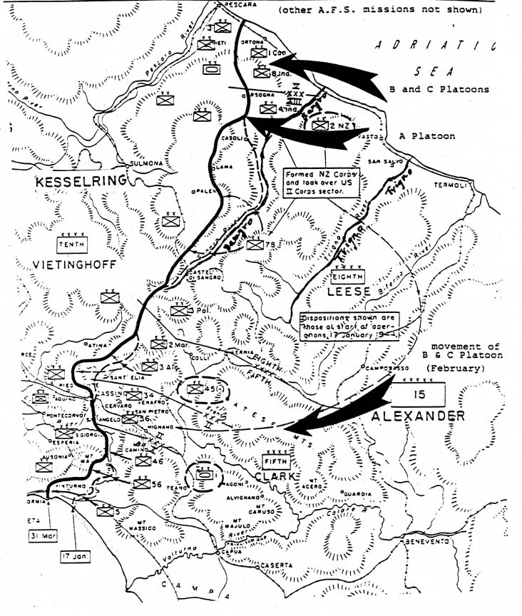 Many refugees were able to return, and as reported in Part VI above the Allied advance continued beyond the city in a vain attempt by the New Zealanders, Indians, British and Canadians to force the Gustav line along a 15 mile stretch between Ortona at the coast and Orsogna on a lateral road west from Ortona. Both towns were reduced to rubble. The advance reached just north of Ortona; the Germans held at Orsogna. Although our C Platoon had been pulled back to Pollutri December 15, and then transferred with B Platoon to Cassino in February, other AFS Platoons took over and continued on the Adriatic front at forward posts.