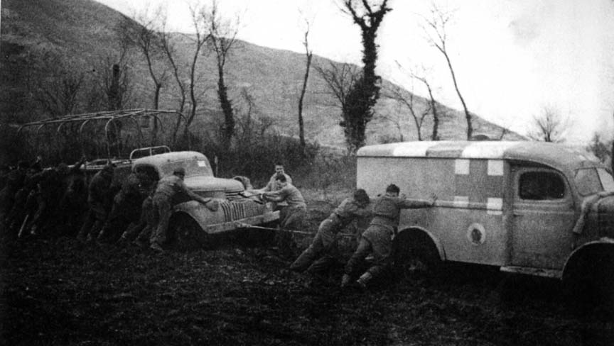 Since moving up to San Vito from Pollutri, we had enjoyed bright days and crisp nights in those final days of January, 1944. This was too good to be true, and torrential rains soon followed, adding to the difficulty of evacuations over dirt tracks and crowded roads. Our four-wheel drive ambulances always brought us through, although a major concern was to avoid getting stuck in the mud!