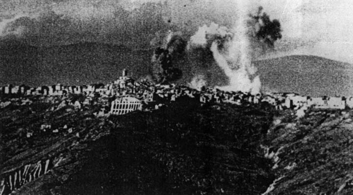 At mid-morning of February 15 (as I recall) we were startled by the drone of flights of bombers of 8th American Air Force in majestic array above and through the clouds, with fighter escort. It was the first time any of us had seen the storied B-17 "Flying Fortresses" in action. They passed high overhead. Then the thunder followed, and man-made clouds rose above the mountain where the Abbey once stood. At that time we on the ground thought that there was no alternative.