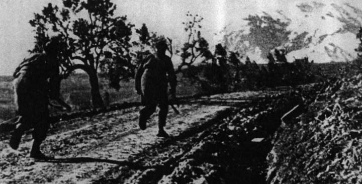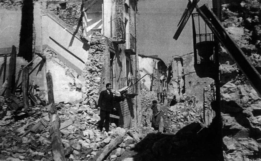 Civitella, and the other mountain villages, were linked by a narrow road, which wound along the very flanks and cliffs of the mountains. It was a marvel of road-building; it was also a possible route for 8th Army flanking operations in the advance from Termoli. To preempt any such action, the Germans demolished all villages along the way, thereby blocking the road with tons of rubble. This was done during the German "scorched earth" program which leveled the bridges, rail and electric lines, roads and abutting structures in the path of the advancing 8th Army.