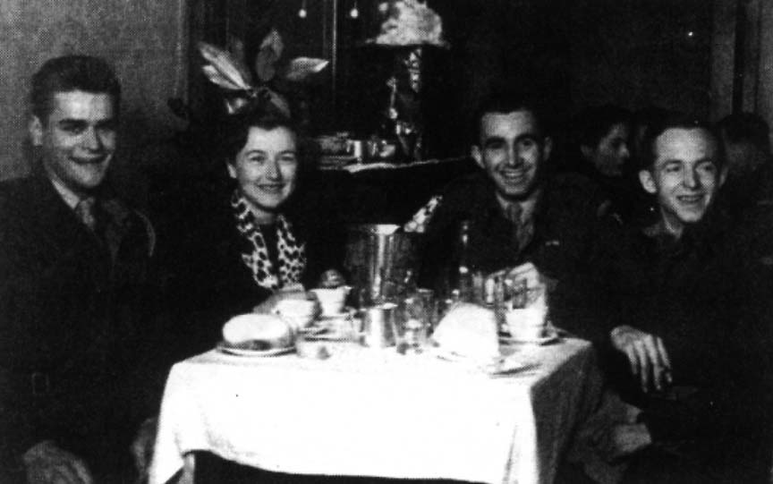 While at "our" Club (American Red Cross) we had some photographs taken of us together by the Club photographer which I mailed home. There is a copy of one of these on the following page, and below it with both of us at dinner at one of Rome's newly opened Clubs together with C Platoon's "Skip and Paul" (Skip McKinley and Paul Morris). Skip and Paul, en route to Naples and home-leave, had most of their travel kits stolen while in transit from 567 HQ to Rome. They had fortunately reached Belotti-Bon and safe haven shortly before my return trip to the Company, to stay on another four days. Skip sent me the photograph from home, and also a package for Licia.
