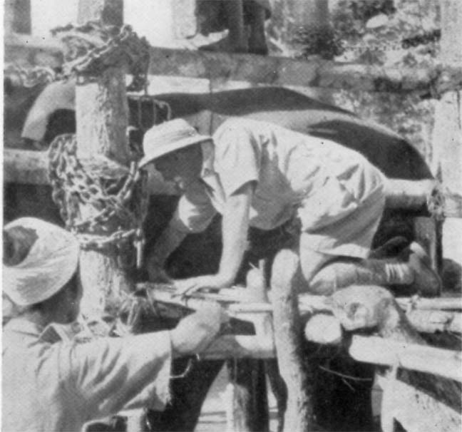 Once the calf is inside the crush, the forefoot which is still in the noose is tethered to the apex of the triangle. Bribery is begun at once, but the calf is at first far too intent on getting out of the cage to take the tid-bits offered to it. It will usually struggle and kick for about two hours. Then it sulks, and finally it will take a banana from the oozie out of sheer boredom and disgust. The expression on its face is like that of a child who eventually has to accept just one sweet after it has sulked for half an hour because it cannot have the whole bag.