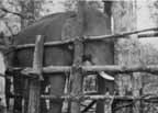 In November of its fifth year the calf is weaned, and from that moment becomes more independent. Five or six calves are trained at a time in one camp. A Burman specially picked as a trainer is in charge, assisted by two men per calf, with eight other men to do general work. A training camp should be in flat country near a stream. An area of a hundred yards square is cleared, except for a few trees to give shade, leaving only a carpet of earth. In the middle a" crush" or triangular-shaped pen is built of logs of about the height of the average five-year-old calf. The logs of which it is built are fastened with wooden pegs; no nails are used in its construction. The bark is stripped from the logs, which are rubbed smooth and smeared with grease---all precautions against galling the calf's hide while it is in the crush under training. In addition to the calves with their mothers in camp is an elephant known as the koonkie (schoolmaster). This animal is usually a tuskless male between forty-five and fifty years of age, chosen for his docility and patience.