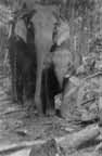 A young male calf about two and a half years old, and his mother. He is eating a leaf and challenging an intruder. The mother's turned-over ears show that she is at least forty-five years old. |