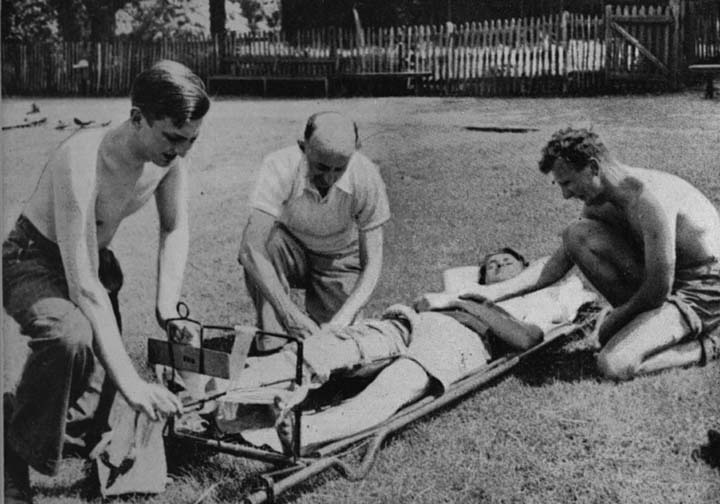 Each Camp modified and, in its own estimation, improved the programme of its predecessor, but it was the First Camp that set the pattern. There was a Commandant, Richard Early from Witney, and a Quartermaster, Peter Hume from York. Later camps introduced a Training Officer apart from Commandant. There were six sections, each with its appointed leader and its own stable or cowhouse. Members were unpaid, and so they would remain throughout their Unit service, receiving from the Unit only the essentials of life. From a special Mutual Assistance Fund, organized at the First Camp among the members themselves, those who required it received a small allowance of pocket money. There were lectures in first-aid from Dr. Rutter, who served the Unit to the end and showed more briskness in retirement than most men do in their working lives, while Sister Gibbs from Bournville, combining charm and unembarrassed firmness, taught many an awkward youth the intricacies of envelope corners on the beds, of Nelson inhalers and roller bandages. The Unit's debt to both of them cannot be measured. There were lectures from members of the old Unit; there were route marches too, and P.T. and runs and manoeuvres and "tea and bath" with local Friends on Sunday. In the evenings, silent devotionals after the manner of Friends helped to bring spiritual cohesion.