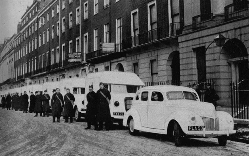 For some time there had been a Transport Department to attend to the Unit's immediate needs, and there was a small garage in Raven Row. Transport was the key to any emergency work \in London, as elsewhere---enough of it and well serviced for immediate use. So, first under Ivan Sharman and later Derryck Hill, the Transport Section grew. More cars and trucks were obtained by loan or purchase. By March 1941 there was a queer collection of twenty-seven vehicles of fifteen different makes. Each had its little ways and had to be nursed and wheedled into action by the Unit's few mechanics---OC28 and BYN and PLO and Dame Colet and the rest. Very soon the garage in Raven Row proved too small, though it served the Unit throughout the worst of 1940 and 1941, and most of the servicing had to be done in the small yard in front or in the road outside. Eventually, in September 1941, when Leslie Gardner had taken over from Derryck Hill, who had followed Ivan Sharman overseas, a large commercial garage was rented just opposite the Commercial Road end of Philpot Street. Here there was extensive parking space and a workshop with adequate facilities for repairs and maintenance and storage. The Section grew until at one time there were nearly fifty men in it. New vehicles appeared, two 3-tonners from the Ministry of Health and, as a final flourish, a bus which proved a white elephant and was sold again. Cars and lorries were needed for routine journeys, for shelter rounds, for the canteen, for the transport of equipment and supplies in London and the provinces, to be always available for the Mobile Squad. Vehicles were attached to provincial centres and came up to London periodically for overhaul.