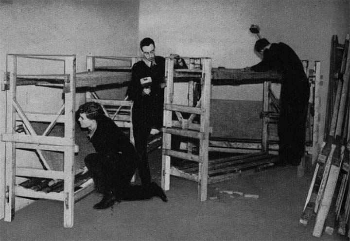 The preparation of new Centres, both in London and the provinces, became one of the Unit's main jobs. A group would go along to a barracks-like school that might not have been in use at all for weeks or months. With the help of the Unit's own Work Squad of carpenters and joiners and decorators, they would clean the place out, plan the accommodation---office, stores, dining-room, sleeping quarters, recreation room, play-room for the children---arrange for structural alterations, for black-out for the windows, paint and distemper on the walls. Finally, there would be indents for furniture, stores and equipment for kitchen and dining-room, mattresses and blankets for the sleeping quarters. Emergency precautions were put in hand for fire-fighting or for hurried evacuation if the Centre were itself bombed. Soon it would be ready to receive its first clients.
