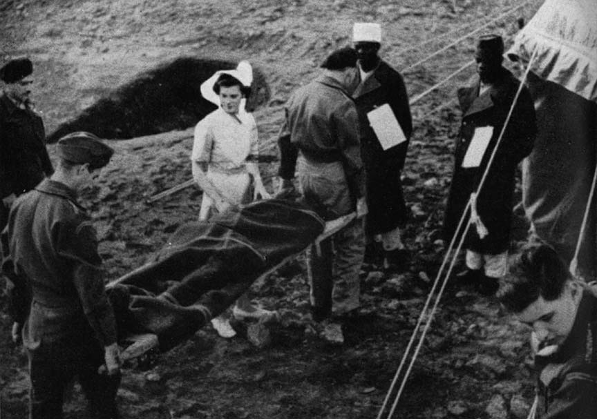 "We cut off their filthy clothes, washed them, and gave general first aid attention, until the doctors could examine them. The worst cases were either operated on at once, or taken into the Resuscitation tent for blood transfusion, or a drip saline, or just for special watching. The light ones often had to face a long and gruelling wait All three operating theatres were going all out, day and night, with a surgeon, anæsthetist, sister and F.A.U. orderly in each.
