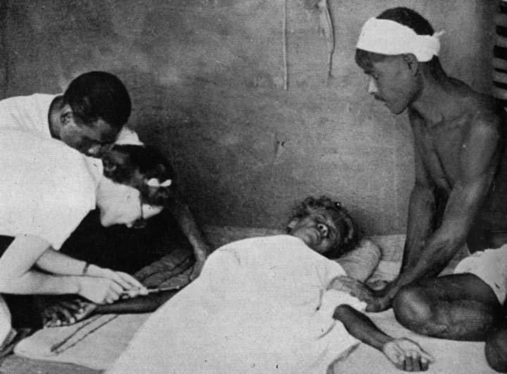 "This part of Bengal can be likened to a worn net of tiny mesh. The spaces are water, the threads narrow, crazy, muddy paths submerging and reappearing, the knots a multitude of mud and thatch villages, now wrecked under a confusion of palms. Our two teams parted, one for the coast, far out of touch. We, an Indian doctor, Jean and I, got busy with the refugees within the Palace grounds. We inoculated all, men, women and babies. We worked amongst lepers. Success was empty, for always came the pitiful cry, 'Why save us from cholera yet let us die for food?' The supplies we had brought were for a wide field. They had to be divided and transhipped.