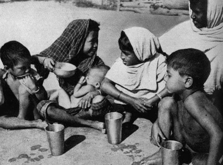 The process of food distribution was pitifully slow, and the Unit soon realized that there was an urgent need for milk, especially for the children. Arrangements were improvised for the sending of milk powder, and canteens were opened in the villages. Pamela Bankart and some Bengali girls went down, and soon the canteen system was extended. Children from a large village or group of villages would gather at a central spot where the powdered milk, would be mixed in water boiled locally and they made to drink it on the spot. The work was financed originally by newspaper articles, and soon the Unit was feeding a modest total of 500 children each day. Great help was afforded by the military, particularly with transport and distribution.