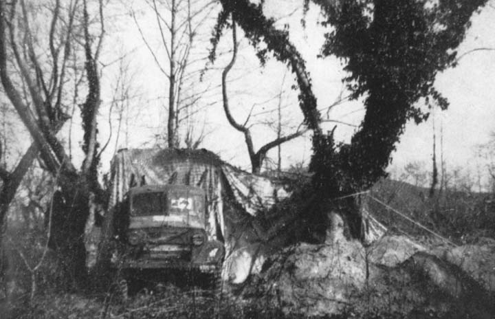 The 6 Field Ambulance MDS was in a pleasant spot among spreading oaks below the northern slopes of Mount Olympus. Tents were pitched on the banks of a small stream. Wards for receiving, operating upon, and holding patients were dug in, and an attempt was made to protect them further with sandbags. The whole dressing station, including the men's living quarters, was heavily camouflaged with coloured nets and natural foliage. Apart from the small amount of medical work, the chief activities were some roadmaking and sandbagging of the operating theatre, and the men were able to enjoy some days of comparative ease and quiet.