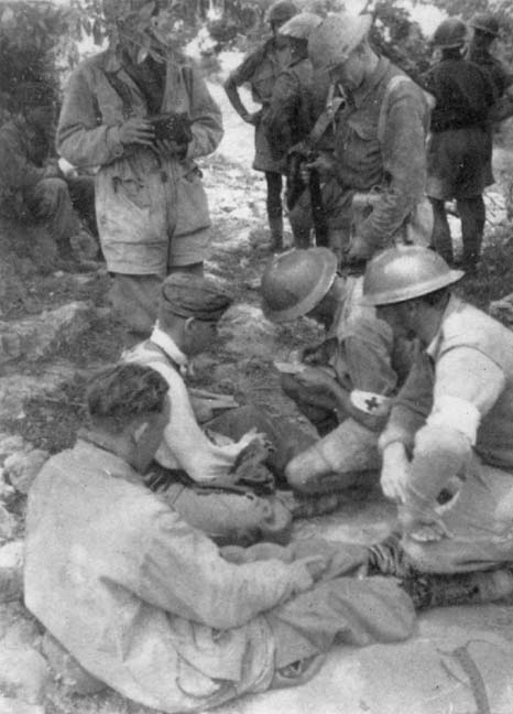 'As we went on, our own artillery began to fire, with a sound that nearly split our eardrums. About a mile down the road a series of caves in the mountainside offered shelter from the still steadily falling rain, and in one of these we prepared to receive wounded. In the cave next to us flocks of sheep had been shut in for protection against the cold, and two small shepherd boys guarding them set to work, unasked, to find dry sticks with which they lit a fire for us.