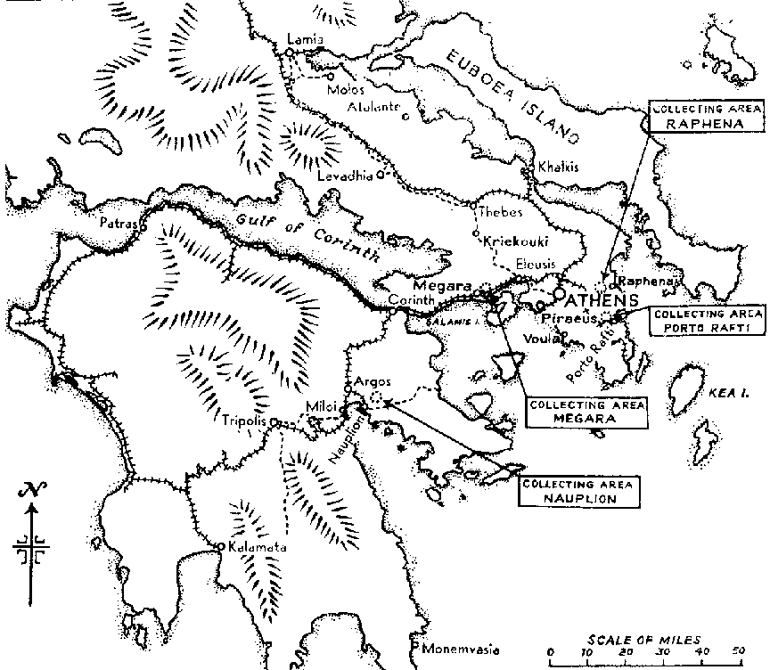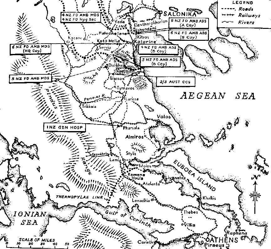 Fourth Field Ambulance went through Larissa to Pharsala, and then turned east to the coast at Almiros, later going to an area a few miles south of Lamia and there setting up an ADS to take in wounded from convoys. Under cover of rain and mist on 17 April, 5 Field Ambulance followed on the long journey to the vicinity of Molos, south-east of Lamia. The ADS, under Capt Palmer,(6) withdrew with 4 Brigade Group early on the morning of 18 April, an ambulance car being attached to each RAP. The car post, under Capt Moody,(7) travelled with the rearguard of 4 Brigade and diligently collected wounded. After a trying journey through Volos, 4 Field Hygiene Section reached Atalante, where it camped on a sheltered site near the sea.