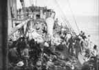 With 22 officers and 777 men accommodated in the holds and on the decks, the ship was uncomfortably cramped. There was only one galley and, with such limited cooking facilities, practically no heated food, apart from tea, was available to supplement the dry rations., of which four days' supply had been brought aboard. Deck dwellers peered down the hatch at men, mess gear, and packs pressed together in the holds, where past passengers---sheep---had left their trademark, and where the smelly air was hot and stifling.