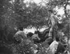When Col Kenrick received word that 21 Battalion had been thrown back, he arranged for four ambulance cars to go immediately to the Peneios Gorge and for medical officers and orderlies to be sent from 6 Field Ambulance at dawn to the western end of the gorge to treat and bring back casualties. For this task Lt Sutherland(5) was put in charge of an advanced dressing station detachment of 25 men from B Company and two ambulance cars. When they reached the neighbourhood of Rapsane they were unable to set up a dressing station, so the detachment remained on wheels and treated wounded in the ambulances. That night was spent under the artillery hill positions with shells from the opposing forces whining overhead. In the early hours of the morning the men packed up ready to move back, but there was a delay as it was necessary to await the return of Lt Sutherland, who had gone forward for information.