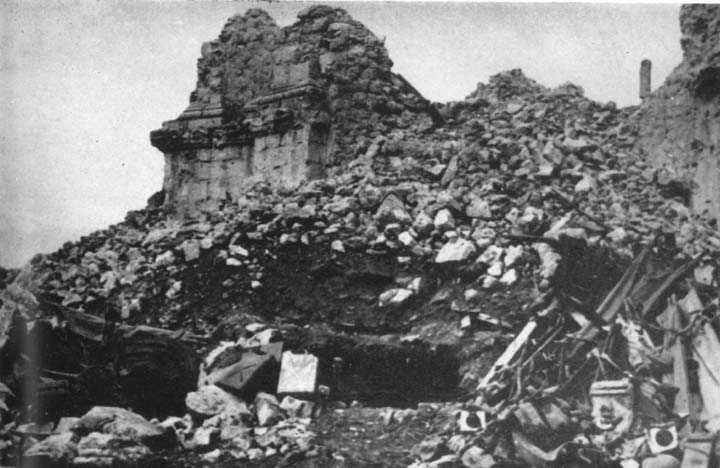 Many members of medical units who were near Cassino after its capture visited the ruined town and monastery, and those passing it at a later date on the way to Rome leaned out of their vehicles to gaze at the destruction. When leaving the main road to clamber over the masonry of shattered buildings, one had to walk carefully as the place was infested with mines. Bodies, too, still lay about. Few, if any, paid the town more than one visit: a repulsive atmosphere of desolation hung over the ruins, the shell-blasted hillside, and the huge bomb craters, half-filled with slimy, evil-looking water. Even back at the unit areas, beautiful as was the countryside, clothed with fresh spring foliage and ablaze with scarlet poppies, some of the men felt an eerie quality about the peaceful stillness.