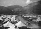 Everyone was delighted with the new location, which was separated from the town by a ridge and a gully. The unit had never before set up as a tented hospital so close to a town. From the ridge Siena could be seen spread out over its hills; silhouetted against the sky was the graceful tower of its famous cathedral and the looming bulk of its many churches. The site where the CCS was set up was a very narrow one bounded on one side by a road (' Eighth Army express route') and on the other by a creek at the foot of wooded hills. Originally it had been an agricultural stadium, but it was a clean area and well drained, with a good system of roads and concrete channels. Thickly foliaged trees provided plenty of welcome shelter and gave an attractive appearance to the camp.