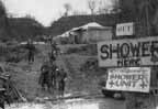 Almost immediately another shell burst on the roadway outside. Traffic skidded to a halt in a cloud of dust that rose to the treetops, and then was away again, flat out. In the MDS area a scurrying crowd suddenly appeared. It was a rush to spread the 40-foot Red Cross sign at the forward end of the spur. Steel helmets began to appear, resurrected from long-forgotten corners in the trucks; and in all directions shovel-brandishing men were rapidly disappearing below ground.